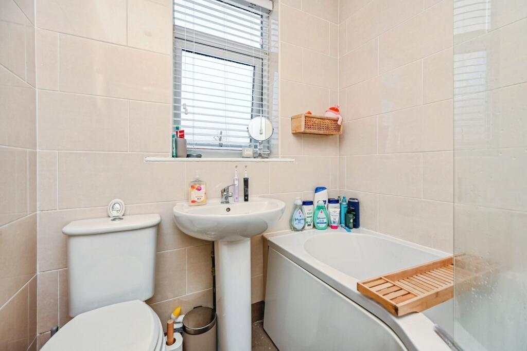 The ground floor provides a through lounge/dining area and a fitted kitchen; upstairs are three bedrooms and a single family bathroom. The property benefits from double glazing (install date unknown) and mains gas central heating via boiler and radiators. Nearby amenities include shops, bus and train links, a retail park and a mix of primary and secondary schools, two of which have Good Ofsted ratings.