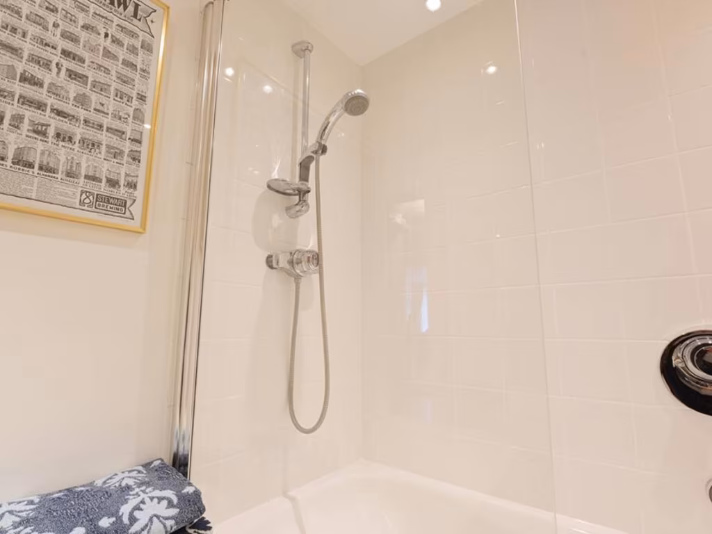 The lower‑ground and basement layout gives two well-proportioned bedrooms, including a large double with built‑in wardrobes and bespoke shelving ideal for bedroom storage or a home office. Electric heating provides straightforward, controllable warmth throughout, and fast broadband plus excellent mobile signal suit remote working and streaming.