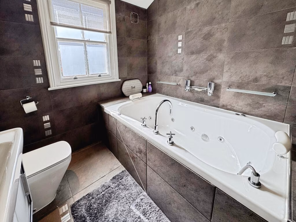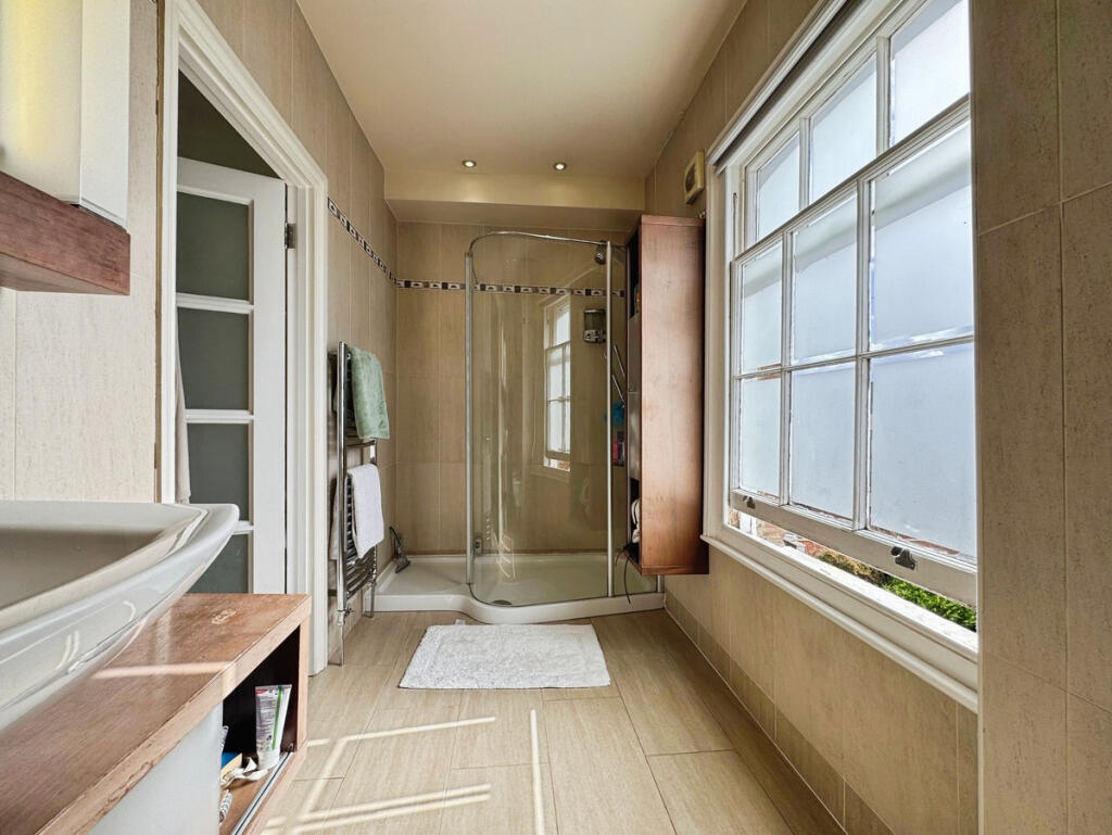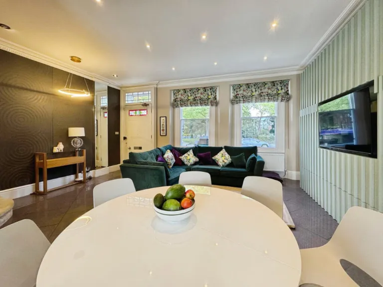 A notable practical advantage is the self-contained lower-ground apartment, producing significant short-term rental income (c. £32,000 gross p.a.) or offering guest/annexe use. The rear garden is low-maintenance and south-facing with decking and astroturf; permit parking is available for residents.