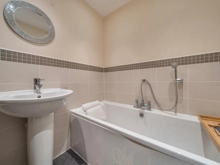 Outside there is a private rear garden (c.30ft x 19ft) with gated access to a garage and driveway located beneath a coach house. The property is freehold, built since 2012, and benefits from double glazing, mains gas central heating, fast broadband and very low local crime — practical advantages for families and professionals.