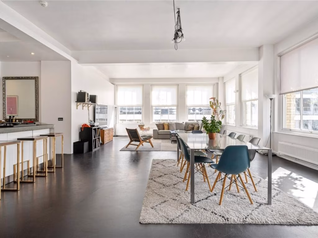 A rare, spacious 1,672 sq ft warehouse apartment set over the third floor of a Victorian conversion in Shoreditch. The dual-aspect open-plan reception and kitchen, eight sash windows and high ceilings create standout natural light and an impressive entertaining space. Resin floors and concrete worktops give a contemporary industrial finish suited to live/work use.