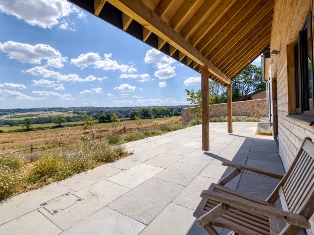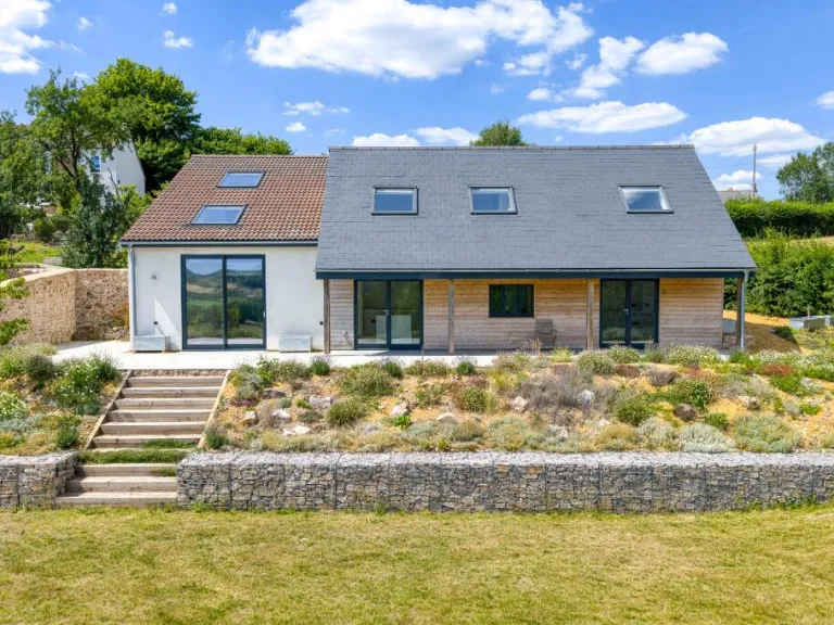 Set on the Mendip Hills in a peaceful rural spot, Vereker House is a recently completed four-bedroom barn conversion offering about 2,000 sq ft of light, contemporary living. The house was finished to a high eco-standard with triple glazing, an air source heat pump, underfloor heating and mechanical ventilation, making it energy-efficient and comfortable year-round. Large glazed doors and Velux windows deliver southerly panoramas across open countryside, and the principal suite opens onto a covered terrace with wide valley views.