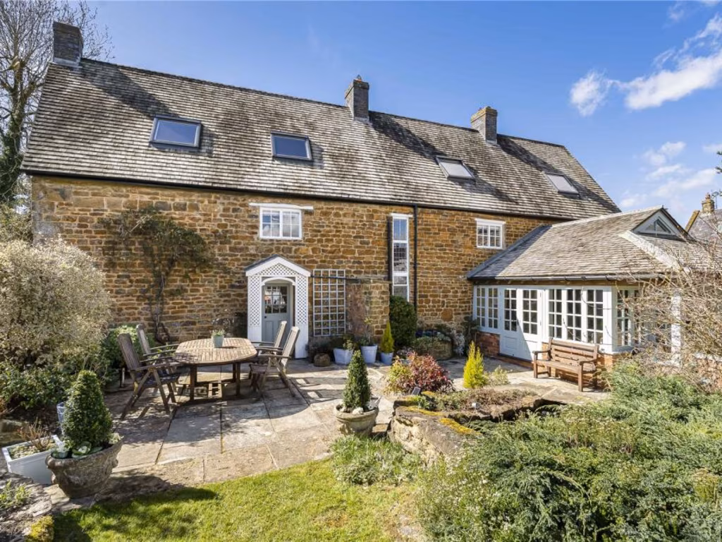 A substantial Grade II listed former farmhouse offering over 3,000 sqft of characterful living on the village edge. Original 17th‑century features — exposed timbers, flagstone floors, inglenook fireplaces and a bread oven — combine with later sympathetic extensions, including a bright garden room that opens onto a stone terrace and large lawned garden.