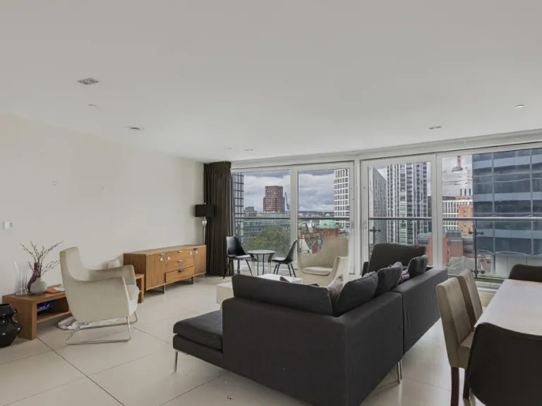 Bright, high-floor two-bedroom apartment in Bezier Apartments, set on the tenth floor with expansive city views and full-height glazing. The open-plan reception and kitchen/ dining area benefits from dual aspect light and two balconies, while both bedrooms have built-in storage and access to a third balcony; the principal bedroom includes an ensuite. Residents have access to a 24-hour concierge, gym, steam room and sauna; two lifts serve the block.