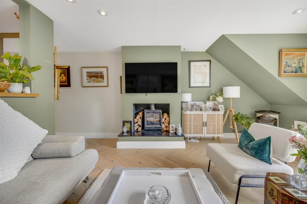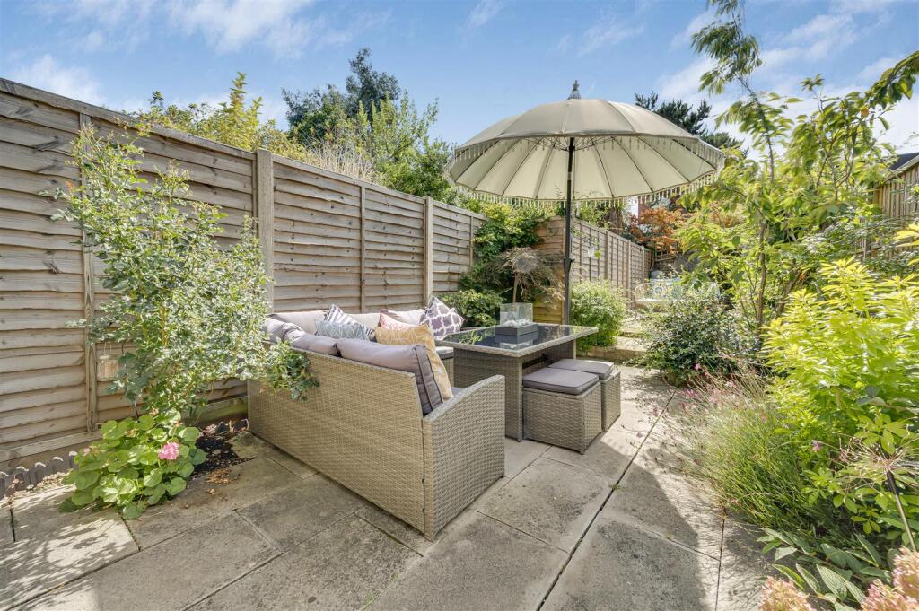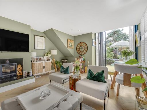 Accommodation is arranged in a linear plan with two double bedrooms, a stylish family bathroom and an open-plan reception that folds out to the garden via wide doors. The layout is efficient, though rooms are modest in scale compared with larger suburban homes; the space feels light and well-connected to the outdoor area.