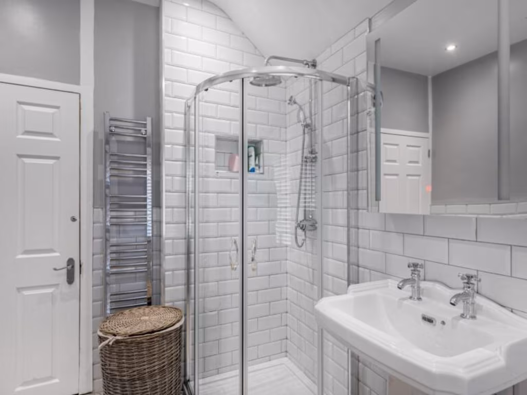 Downstairs offers flexible living: a bay-fronted sitting room, a cosy reception with a log burner and a useful guest cloakroom. The kitchen is designed to a high standard with solid oak and quartz surfaces, a central island, high-spec appliances and a separate utility with internal garage access. Original floorboards have been restored to add character.