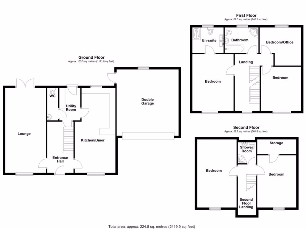 Discover this impressive five-bedroom detached home, elegantly positioned in a sought-after village. Offering 2,419 square feet of flexible living space across three levels, this property is perfect for growing families or those seeking more room to breathe. The ground floor boasts a welcoming lounge with an open fire, a generous kitchen/dining area ideal for entertaining, and a functional utility room. Upstairs, enjoy a master bedroom with an en suite, two additional bedrooms, and a study/office. The top floor reveals two more spacious bedrooms and a separate shower room, perfect for guests or teenagers seeking privacy.