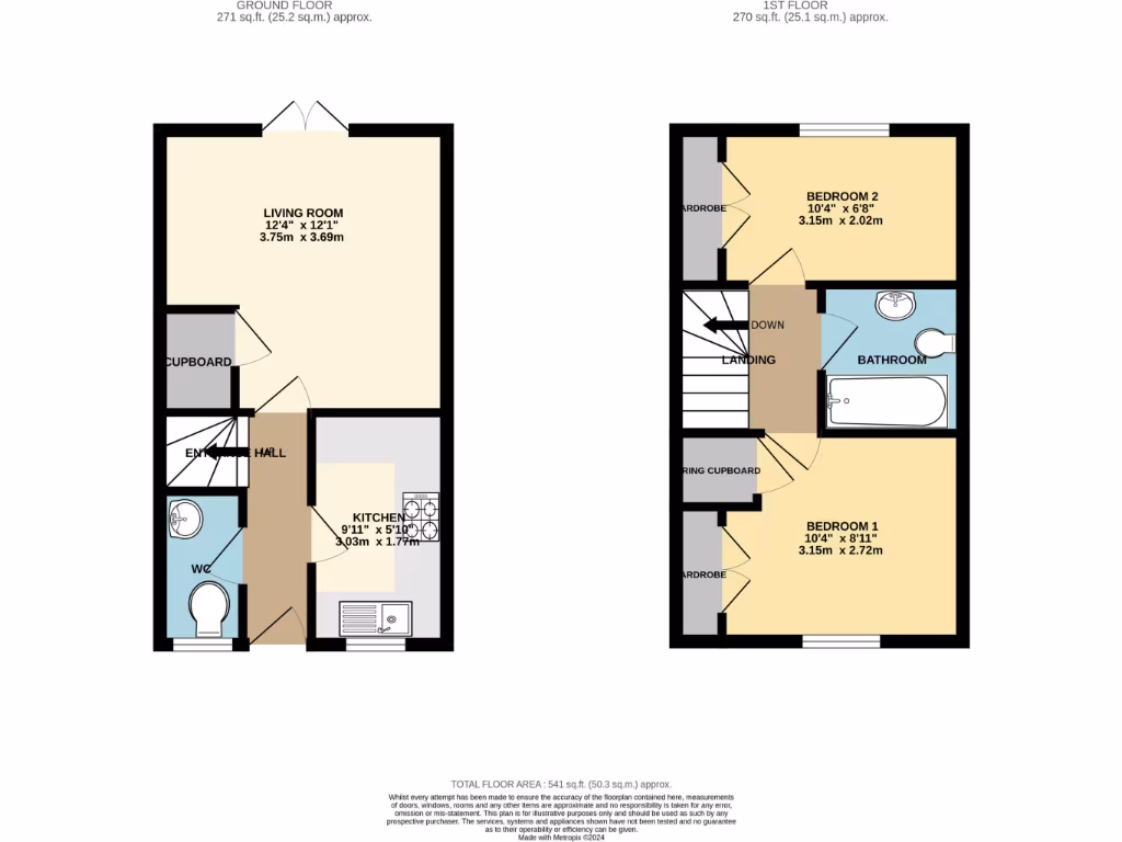 The property sits on a very small plot and the overall internal size is modest (approximately 541 sq ft). The layout is traditional and efficient, with fitted wardrobes in both bedrooms and a simple, tidy bathroom suite. No flood risk is recorded and the tenure is freehold, with relatively low council tax costs.