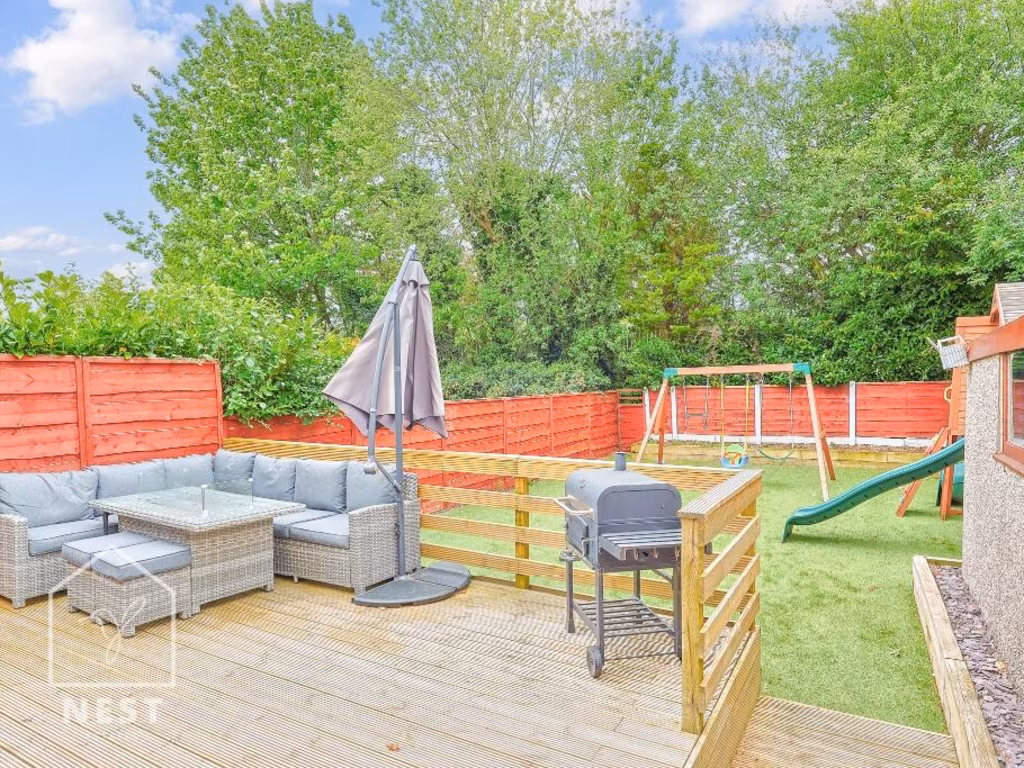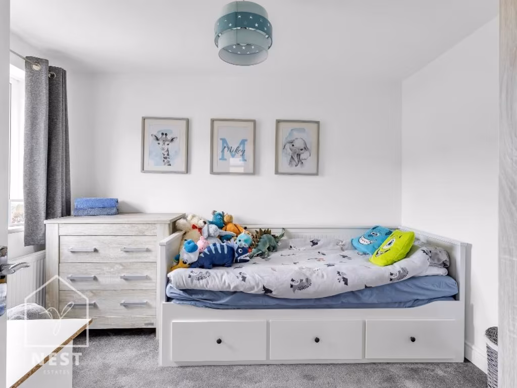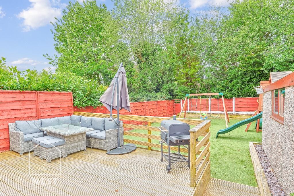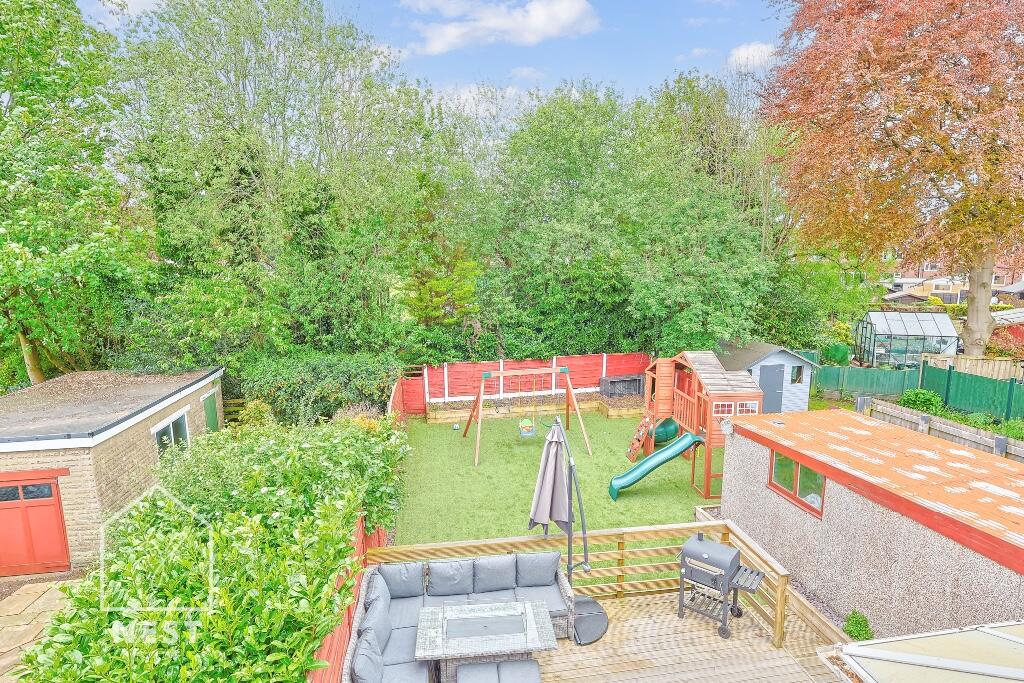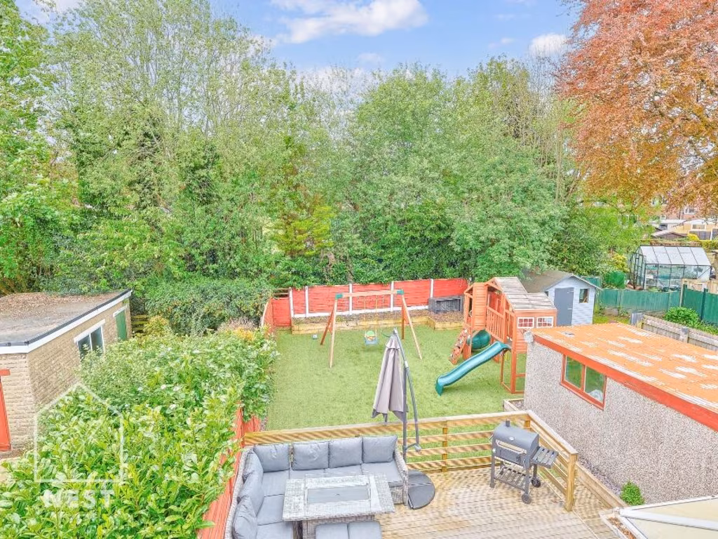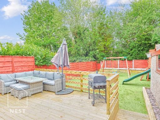 Outside, the property benefits from a generous private rear garden with patio and lawn, plus a wide driveway for multiple vehicles and a single garage. The plot size and garden make this an excellent choice for young families who want outdoor space and room to grow.