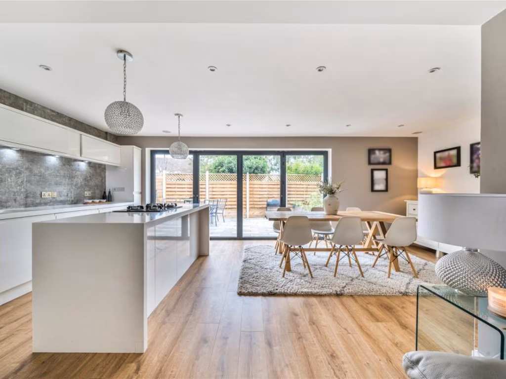 This newly renovated four-bedroom detached house offers a perfect blend of modern comforts and functional space, ideal for families. The heart of the home is a large kitchen/dining/family room featuring an impressive island and bi-fold doors, seamlessly connecting to a private garden, perfect for entertaining. The master suite boasts an ensuite and a dressing room, while the remaining bedrooms provide flexibility for study or guest accommodations.