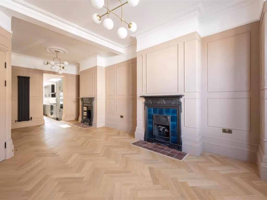The refurbishment is high quality throughout: oak-style herringbone and wide plank floors, two modern bathrooms, preserved fireplaces and new double glazing to the rear. At about 1,575 sq ft, the layout balances reception and bedroom space for family life, homework corners and social space. Leyton Underground is a short walk away, and Francis Road’s cafés and shops are within easy reach.