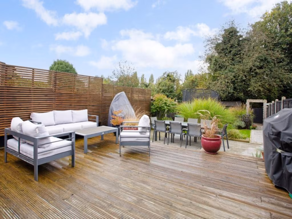 • Landscaped rear garden with deck, lawn, patios and powered shed