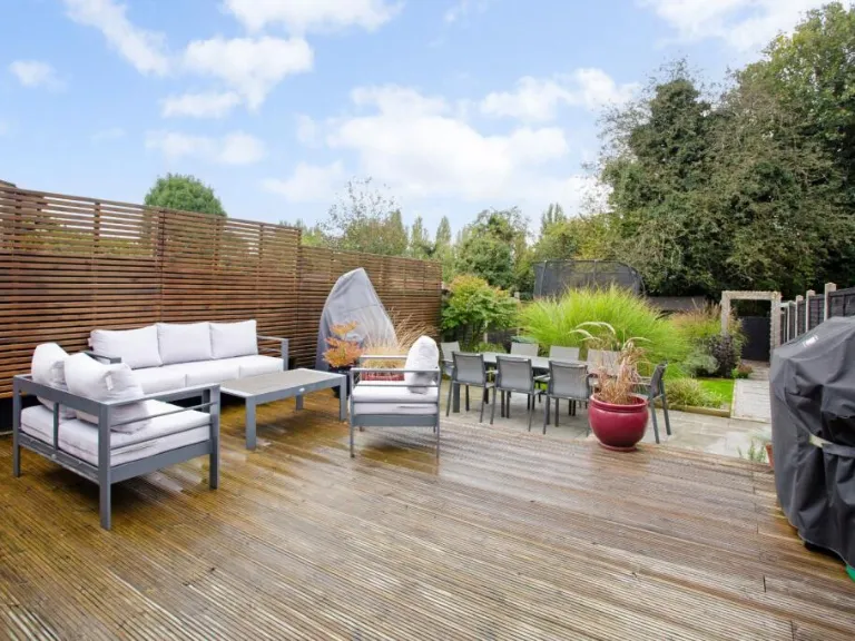 Outside, the landscaped rear garden is thoughtfully divided into decked, lawn and patio zones, plus a garden shed with light and power. The block-paved driveway offers off-street parking and an EV charging point. Practical details include double glazing (installed post-2002), mains gas boiler and radiators, an EPC rating of C and freehold tenure.