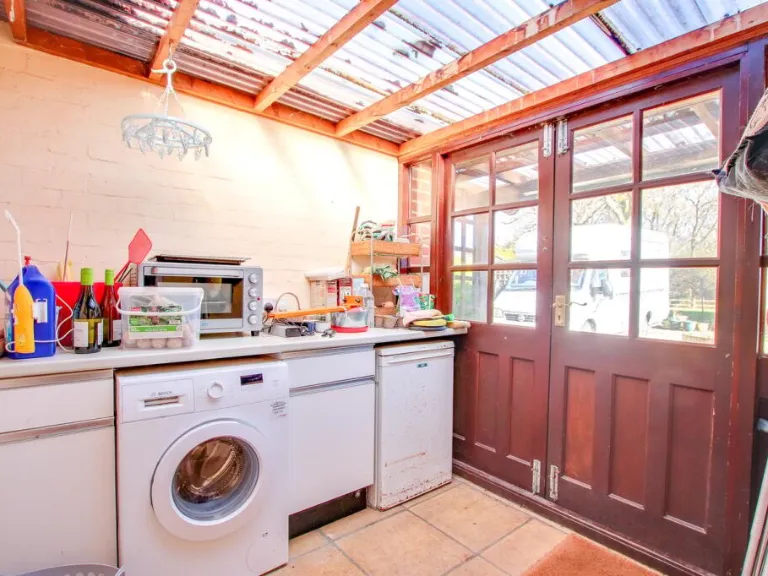 The kitchen/dining room includes extensive fitted units, a walk‑in pantry and a Rayburn; a rear lobby and utility area provide laundry space and garden access. The principal bedroom faces the open forest and includes built‑in wardrobes; two further bedrooms share a separate shower room. The house has underfloor heating, a boiler, and the option of wood‑burning fuel for ambience and warmth.