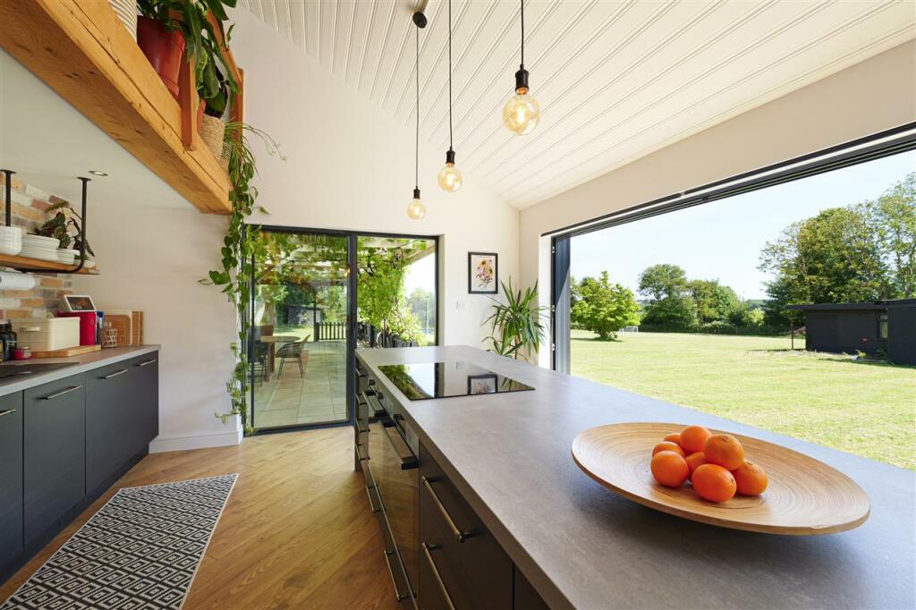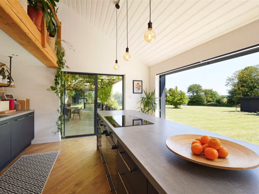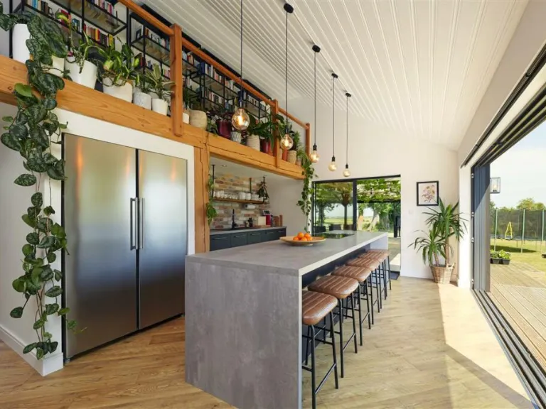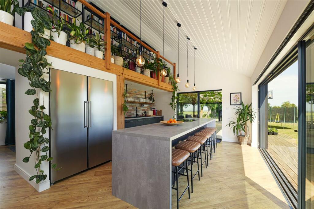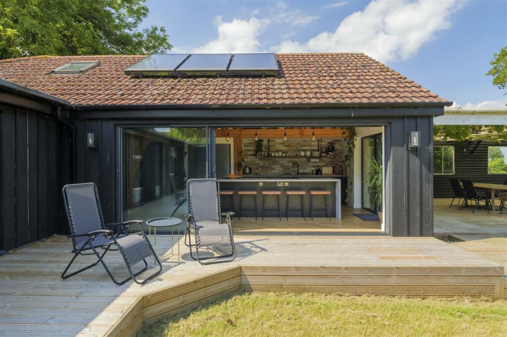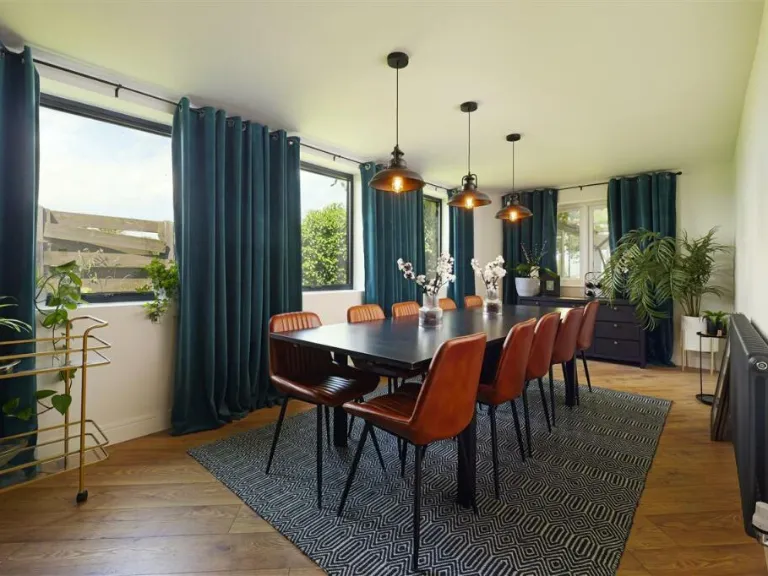 This striking detached bungalow has been transformed into a stunning residence that beautifully blends innovative architecture with creative interior design. Spanning approximately 5,000 square feet, this home offers four spacious bedrooms, including a principal suite with a luxurious ensuite bathroom and private garden access with a hot tub. The open-plan living areas, adorned with large wood-burning stove and contemporary finishes, flow seamlessly into a spectacular kitchen featuring vaulted ceilings and an inviting mezzanine area.