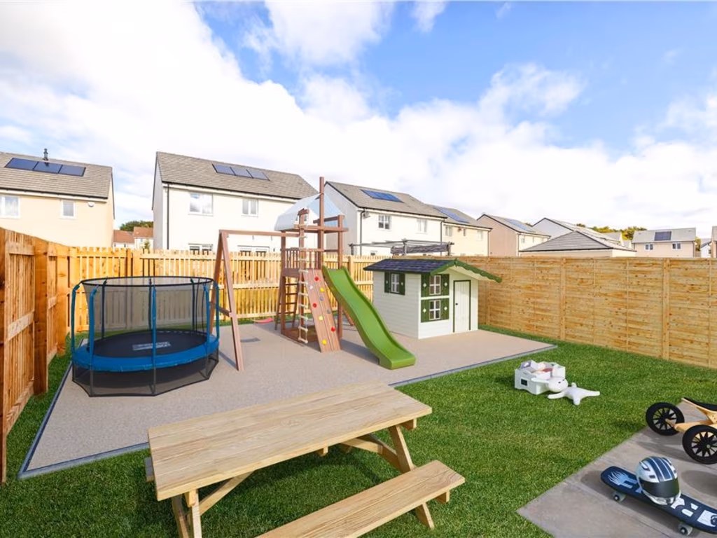 This modern four-bedroom detached house is designed for family living and flexible working. The open-plan kitchen, family and dining area opens via French doors to the garden, creating a bright social hub for everyday life and entertaining. A separate lounge offers a quieter sitting space, while the fourth bedroom doubles conveniently as a home office.
