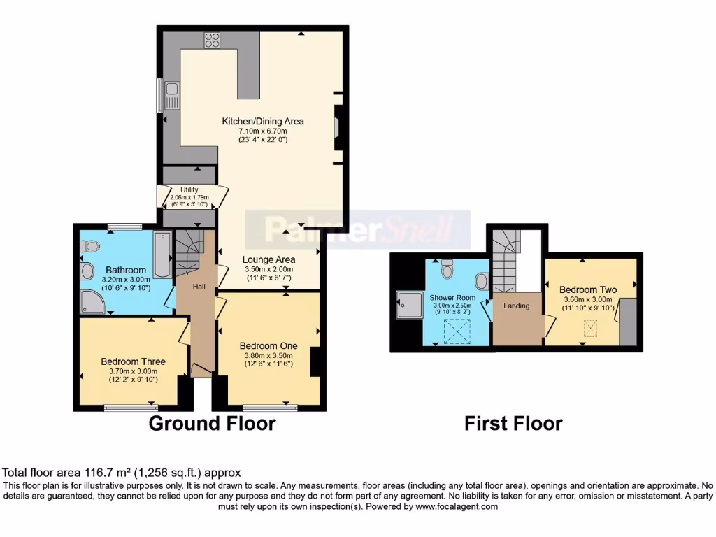 Accommodation is arranged over two levels: two ground-floor bedrooms and a generous family bathroom, with a further double bedroom and shower room on the upper floor beneath Velux windows. Practical additions include an integrated modern kitchen, utility room, built-in storage in the dormer bedroom and newly installed double glazing.