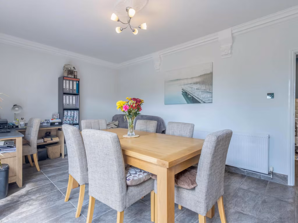 Upstairs are three good-sized bedrooms and a modern family bathroom. The master bedroom includes fitted storage and a contemporary en suite, giving the house practical everyday convenience for family life. Local schools rated Good to Outstanding are within reach.