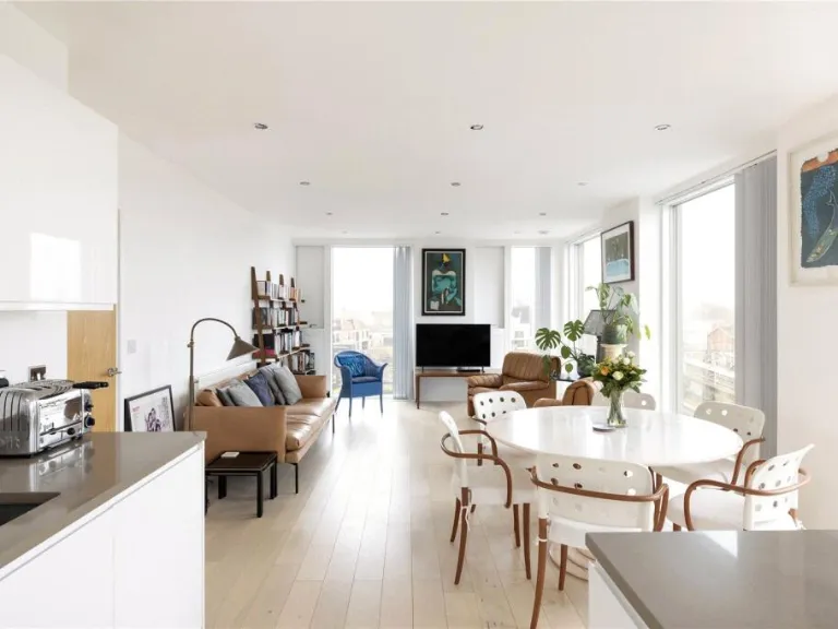 This expansive three-bedroom penthouse in the coveted London Fields area presents a unique opportunity for urban living with a touch of contemporary elegance. Its impressive 35ft open-plan kitchen reception is awash with natural light, courtesy of massive panoramic windows that frame spectacular views of the area’s diverse landscape, from lush parks to historic urban architecture. The immaculate gloss-white kitchen opens onto a charming private balcony, ideal for taking in the surrounding vibrancy.