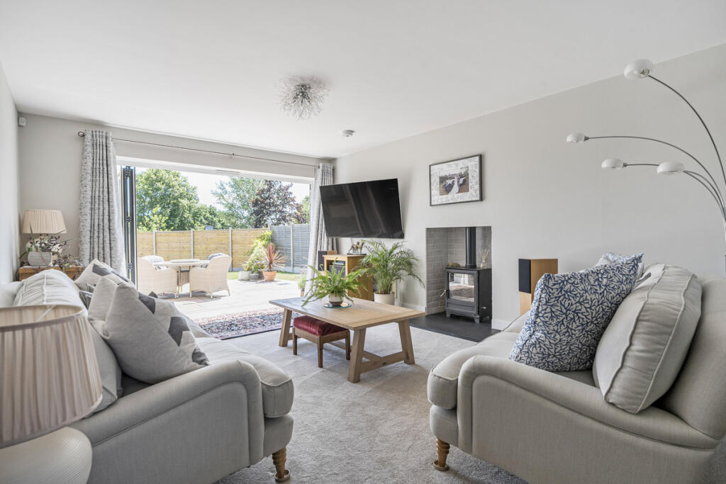This exceptional four-bedroom detached home, set in a serene semi-rural location, offers an ideal fusion of modern luxury and environmental consciousness. The spacious interior features high-end finishes and a clever layout perfect for family living and entertaining. Enjoy the inviting atmosphere of the living areas, where bi-fold doors lead seamlessly to a sunlit, south-facing patio and generously lawned garden, perfect for summer gatherings.