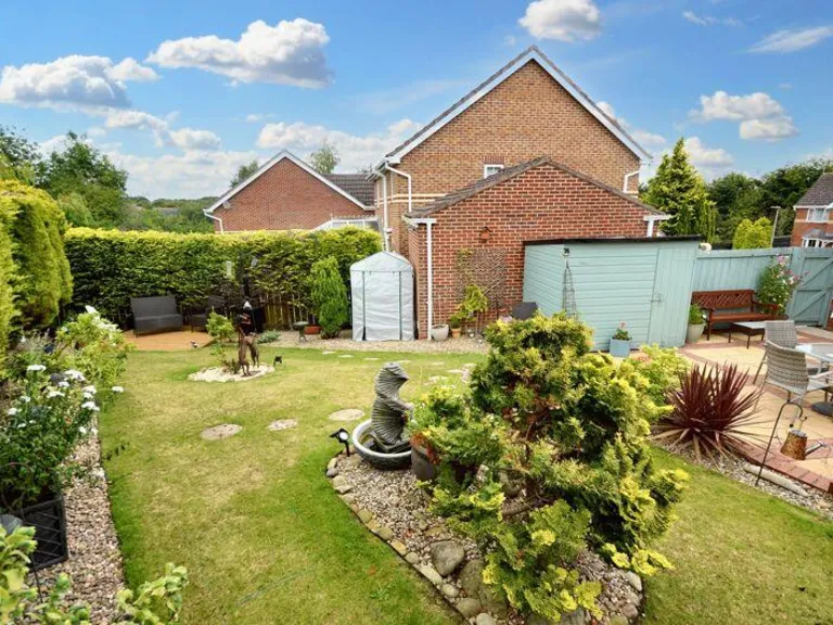 Upstairs, the master bedroom benefits from fitted wardrobes and an en-suite, joined by a second double and a smaller third bedroom suitable for children or a home office. The property is well presented throughout with modern finishes, integrated kitchen appliances, and a neutral decor that will suit a wide range of buyers. Off-road parking and a single detached garage add useful storage and convenience.